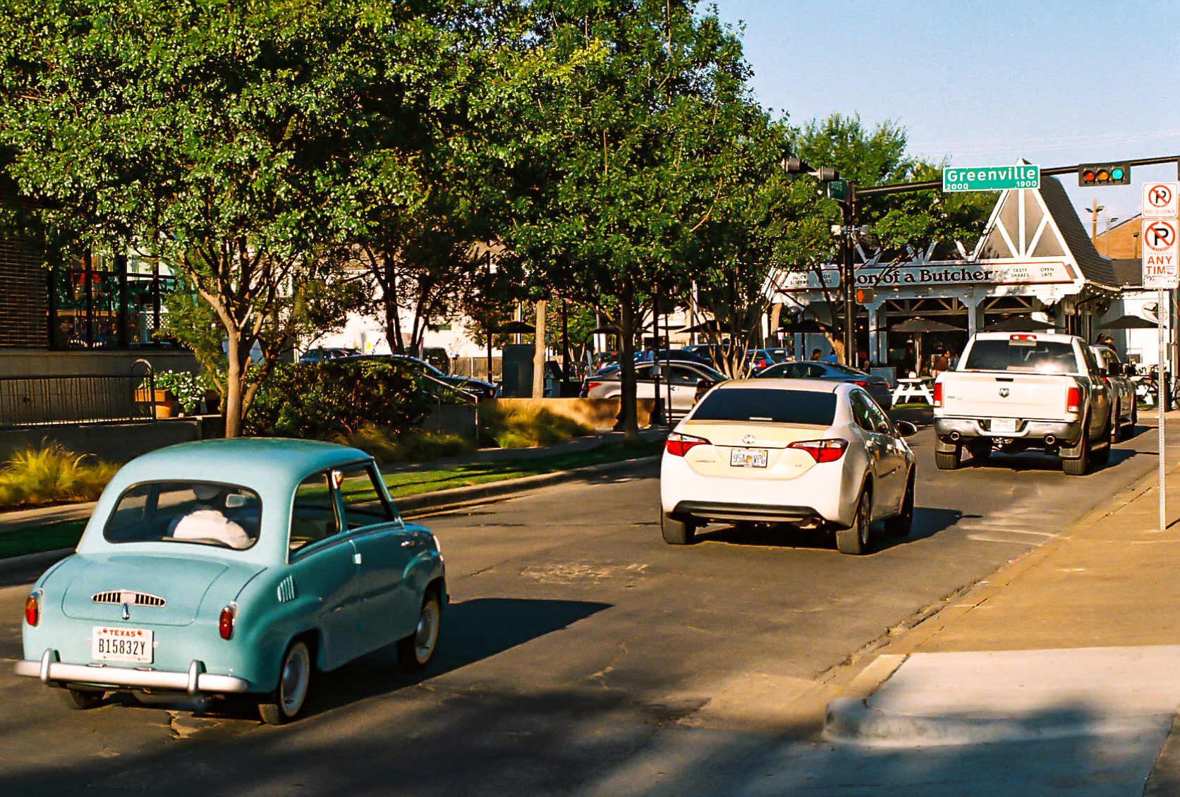 A Fiat 500 heads towards Greenville Ave in the Lower Greenville neighborhood of Dallas, TX, Feb. 8, 2025. Lower Greenville is a trendy neighborhood in Dallas that has a vibrant nightlife with bars and restaurants.