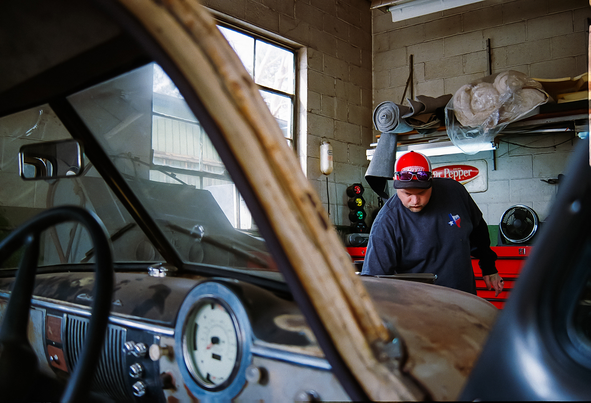 Jason Preston works on a 1950 Chevrolet Ute inside of Preston’s Auto Upholstery in Irving, TX. Preston works with his dad, Larry, at the shop where Larry has been working since 1977.
