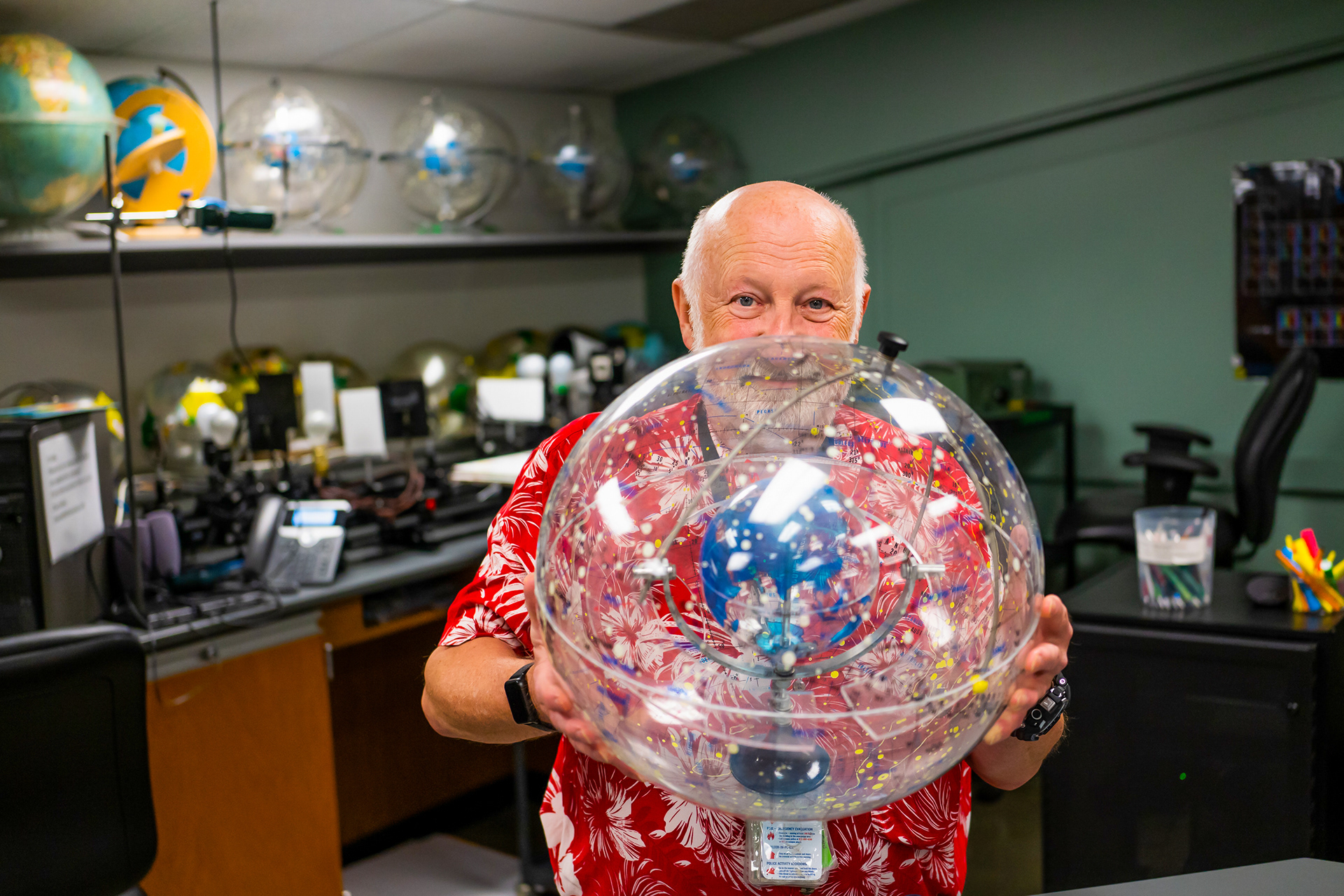 Chaz Hafey, physical sciences lab specialist, looks over a transparent celestial sphere in the science building at Dallas College Brookhaven Campus on April 26, 2023.