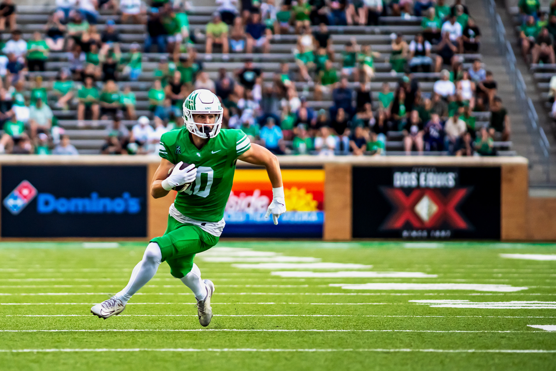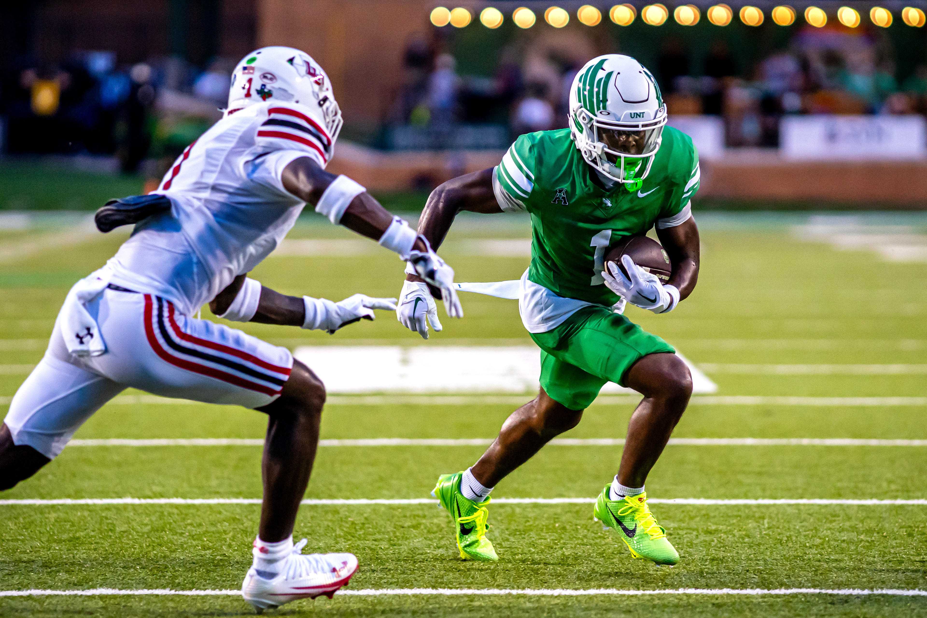 Simeon in the Open Field: Senior wide receiver Simeon Evans evades a defender during UNT's scrimmage at DATCU Stadium.