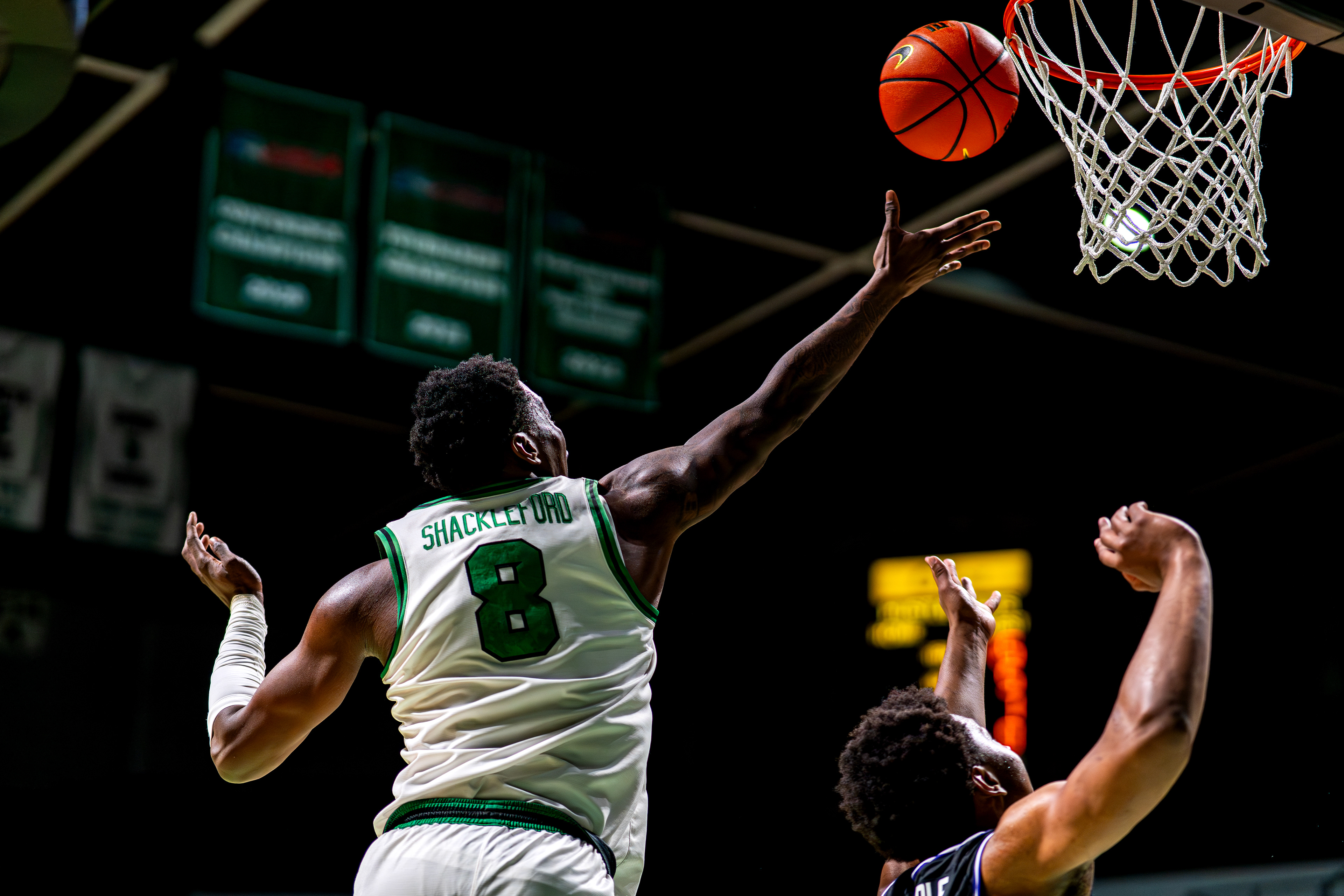 Senior guard Jaaucklyn Moore attempts a layup during the game against UAB at The Super Pit.