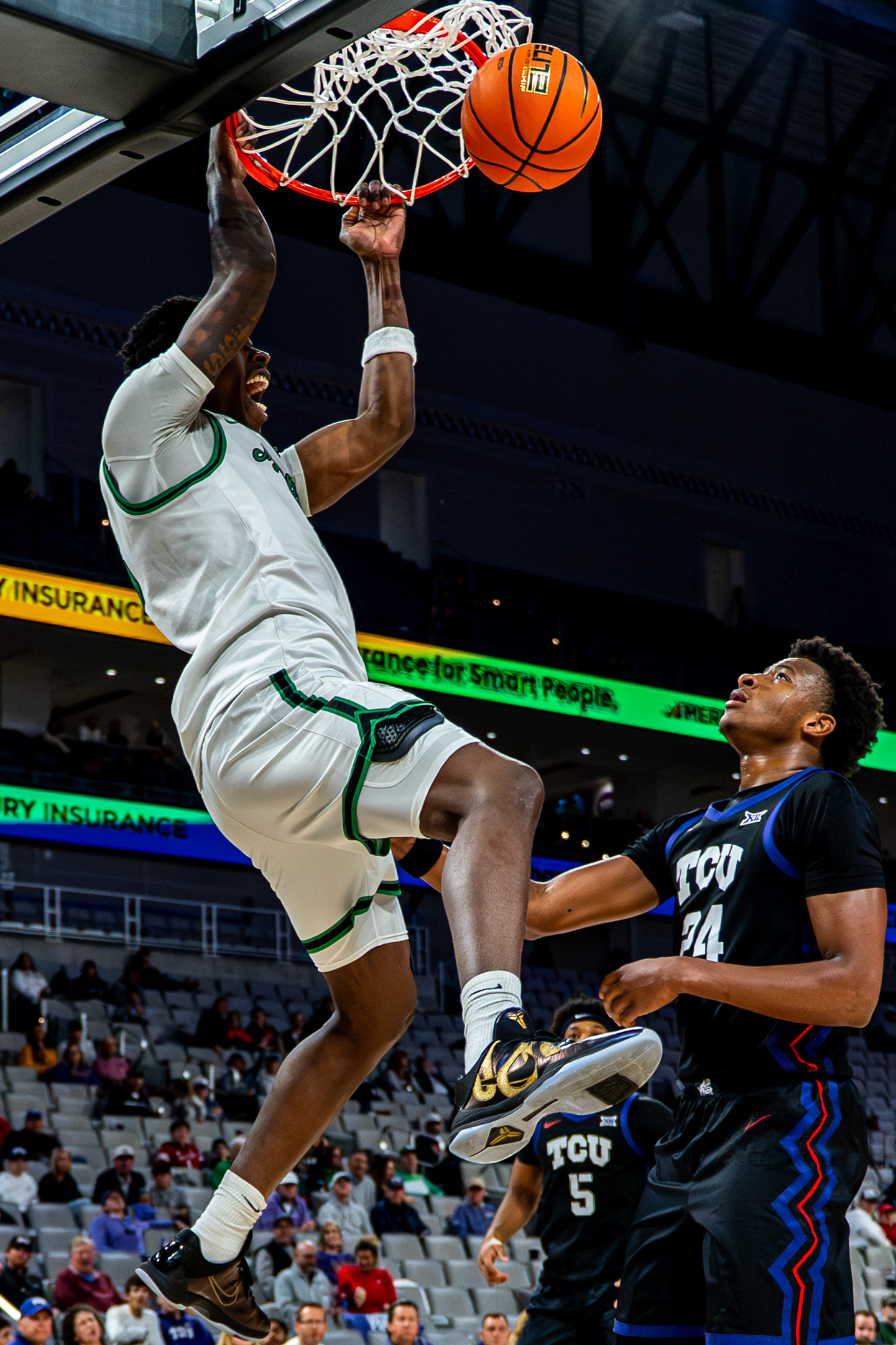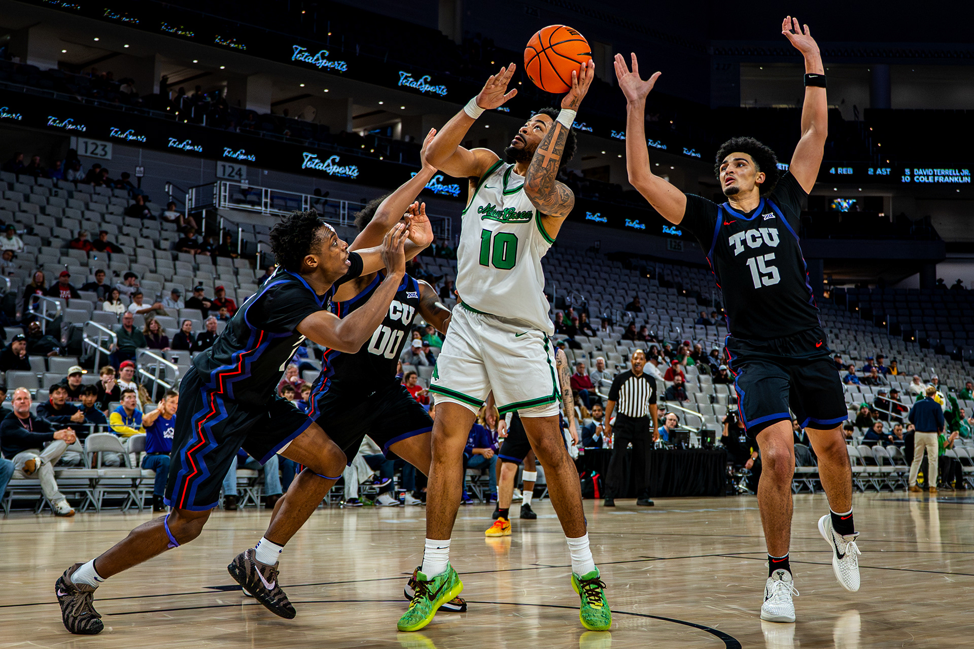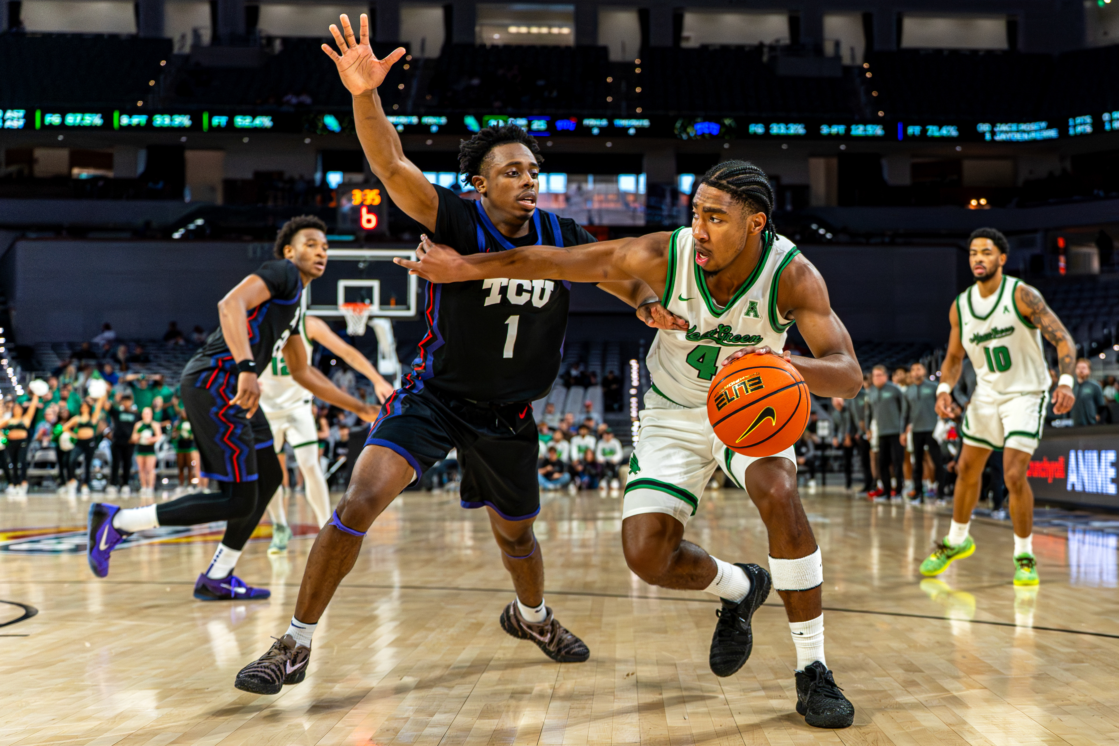 Freshman running back Caleb Hawkins evades defenders against Temple at DATCU Stadium in Denton, TX on Nov. 28, 2025.