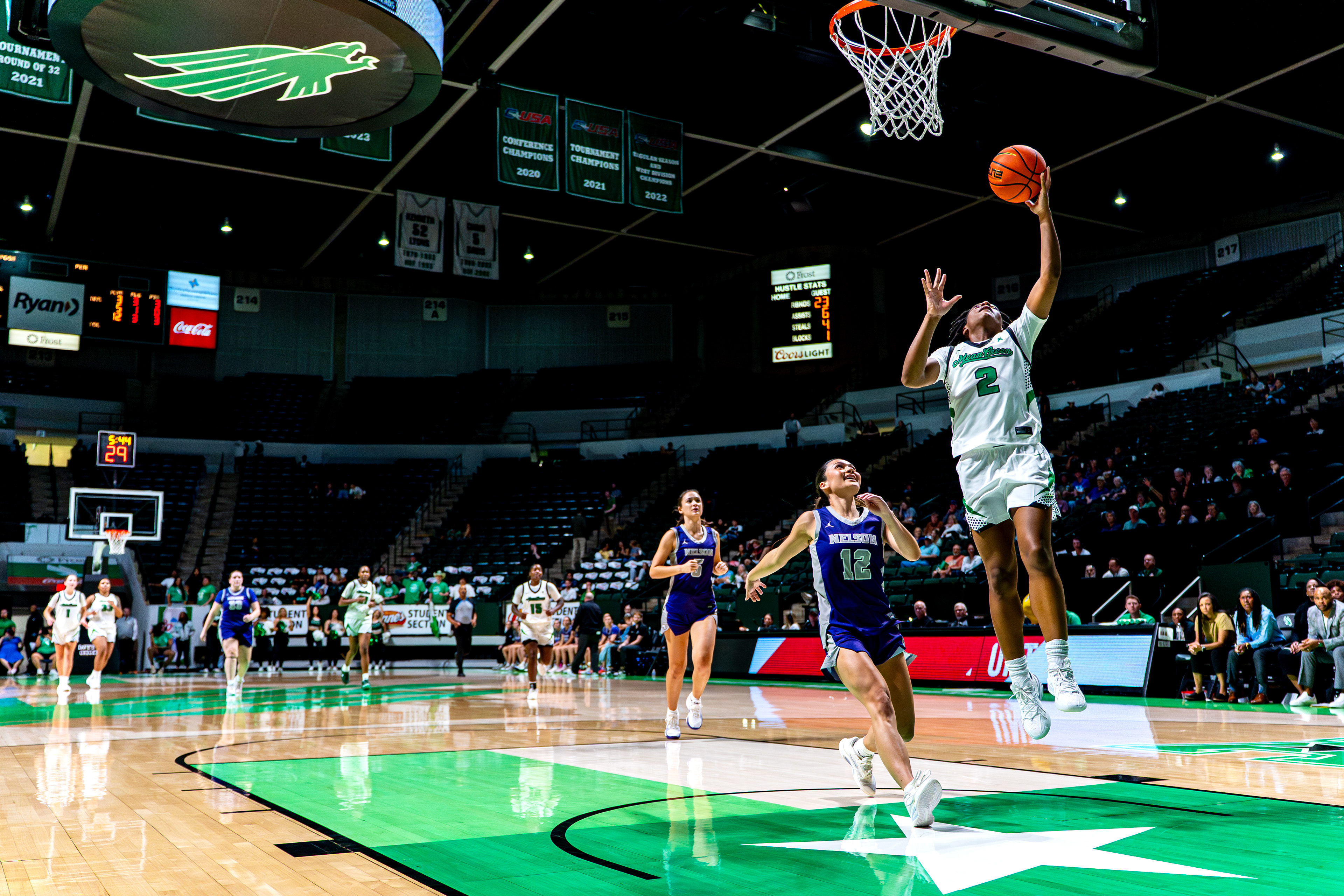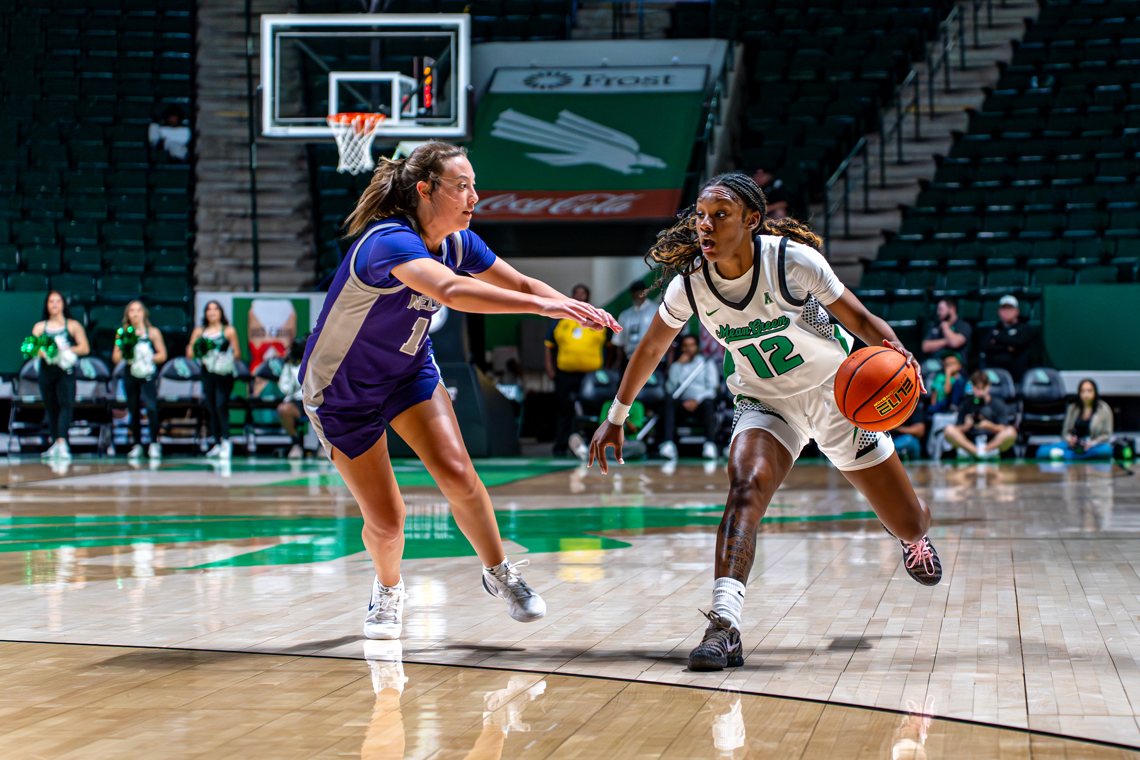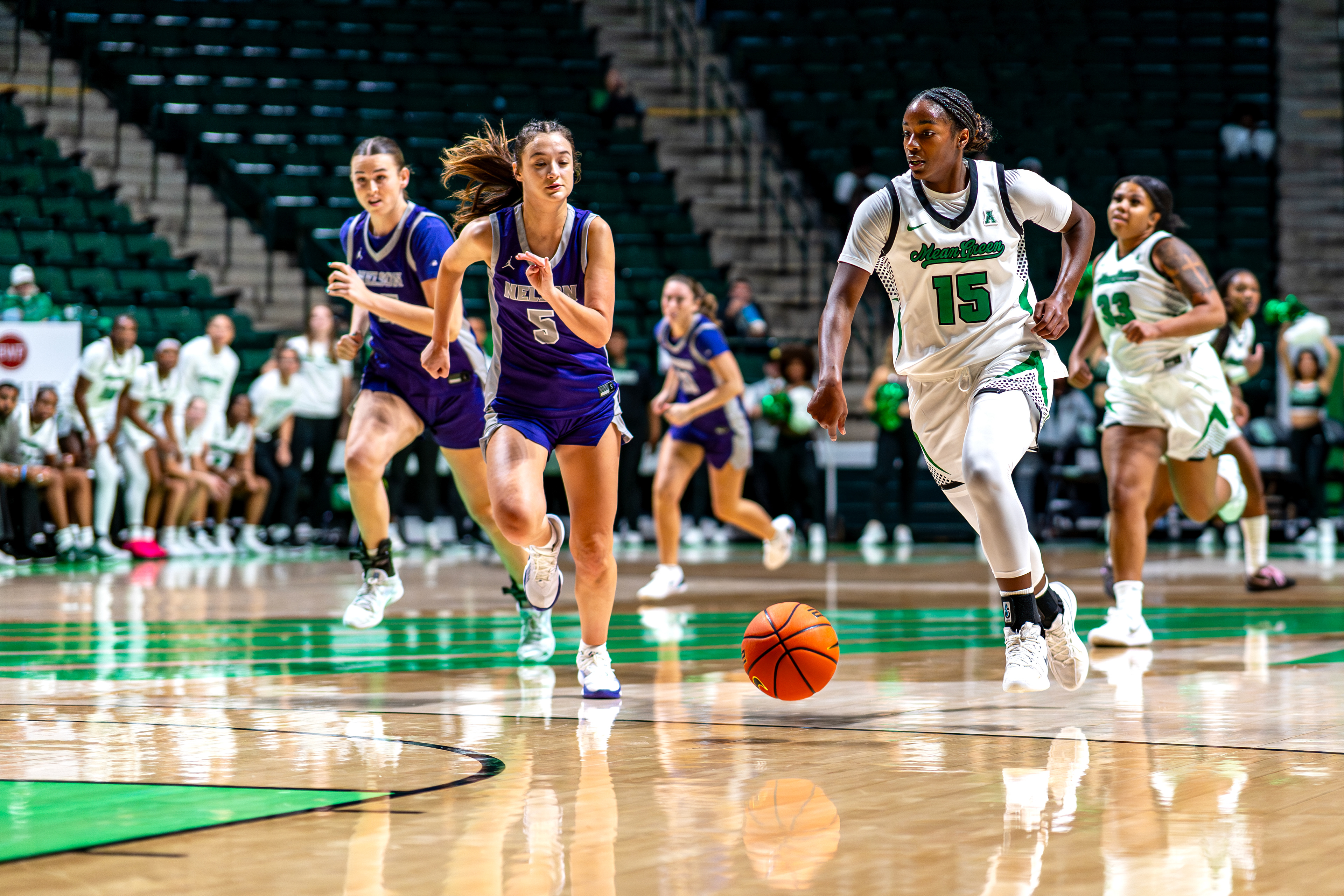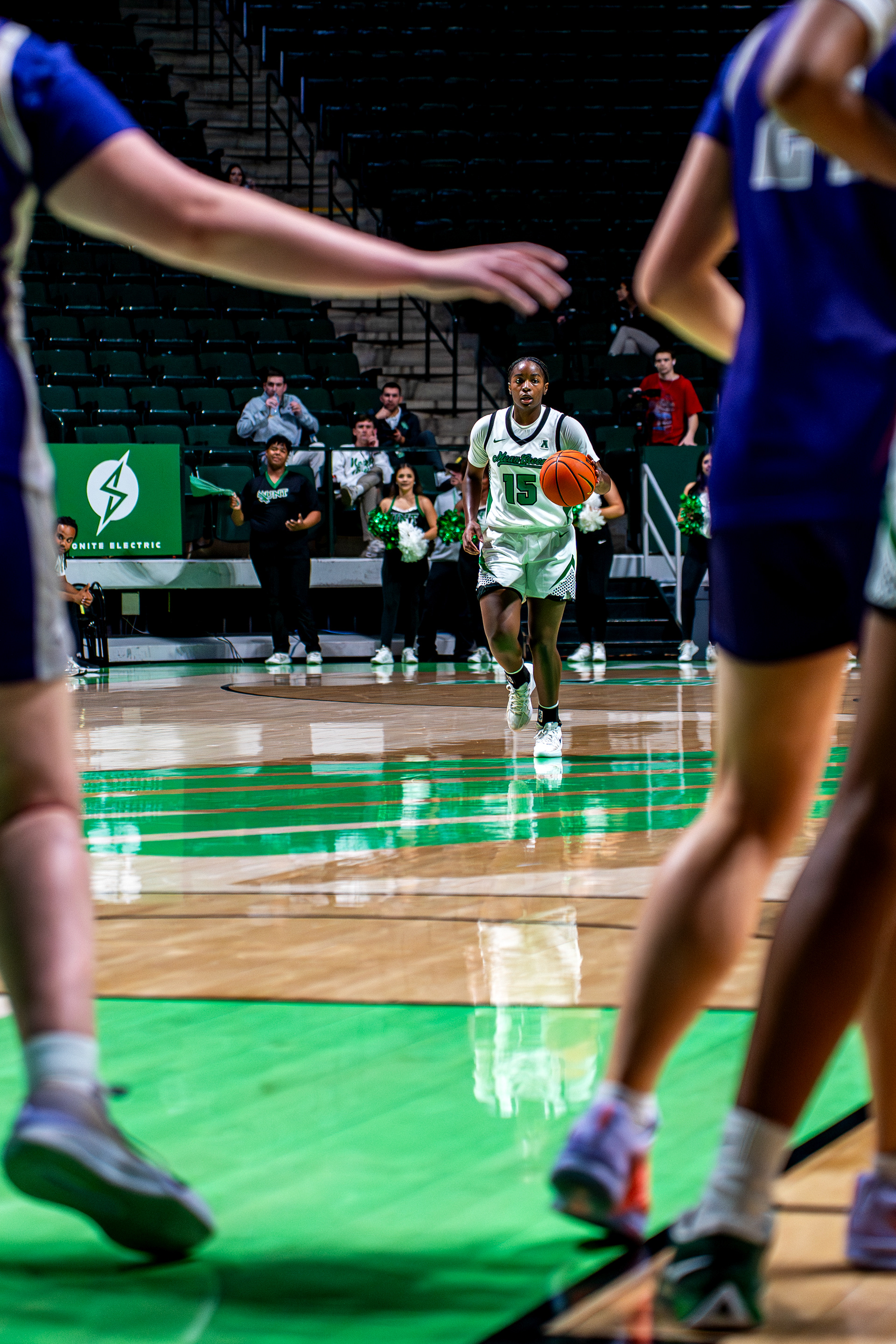 Junior guard Kyla deck dribbles towards the basket during the game against UAB at The Super Pit on March 01, 2025.