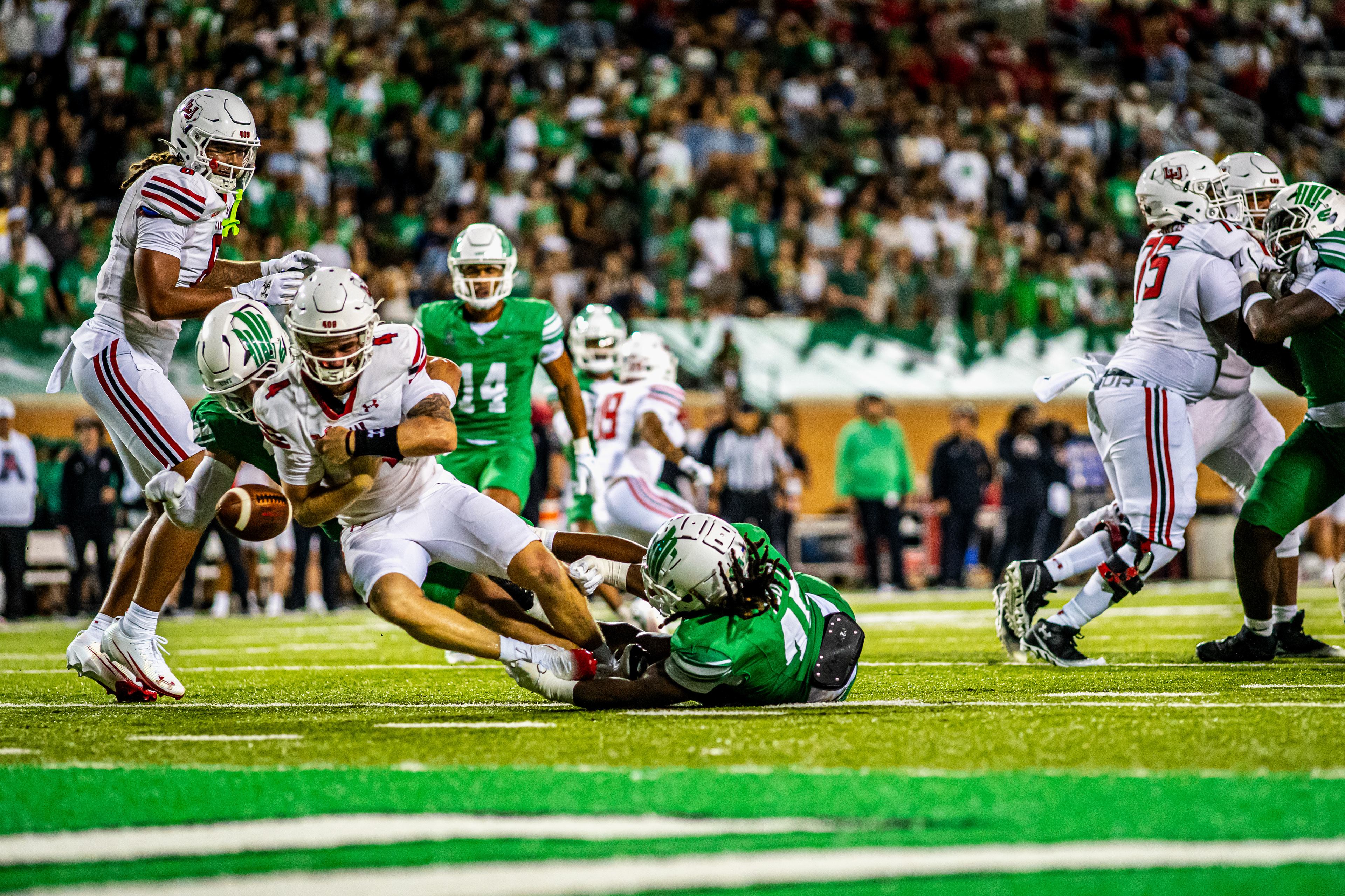 Pursue the Ball: Senior defensive lineman Briceon Hayes pursues the ball carrier during UNT's scrimmage at DATCU Stadium.